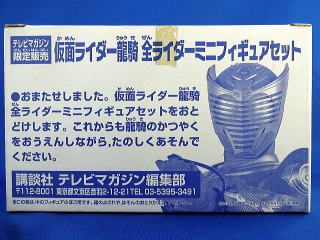 ![]() バンダイ 食玩ソフビ 仮面ライダー龍騎 全ライダーミニフィギュアAセット テレビマガジン限定 中古美品 箱イタミ 1200円 |
