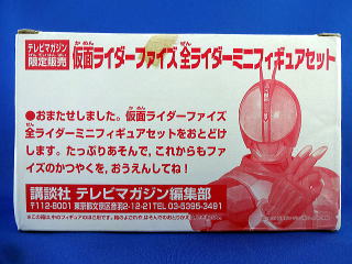 ![]() バンダイ 食玩ソフビ 仮面ライダーファイズ 全ライダーミニフィギュアセット テレビマガジン限定 開封品 箱イタミ 1200円 |