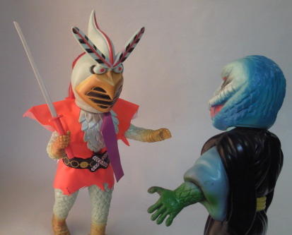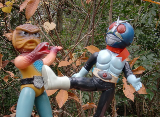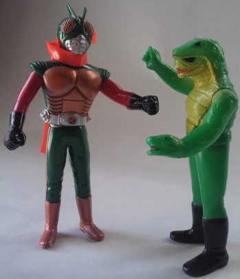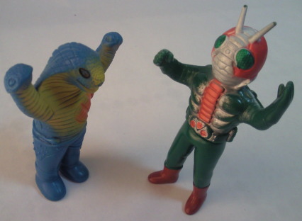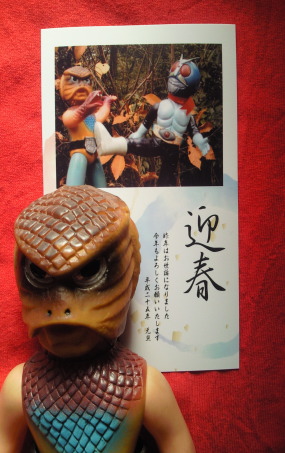 | キングサイズの人形に比べると、 サイズに比例して迫力も小さくなってしまった感じだし、 顔もブサイクで、 なんだか残念な印象を受けますが、 年賀状に使用した写真みたくライダー人形と戦わせて遊ぶと、 そのなんだか残念な印象が、 ショッカー怪人の “敗れる宿命の哀しさ” を演出するのに効果を発揮し、 ときめきと切なさが入り混じった、 なんとも絶妙な味わい・雰囲気が出ます。 ソフビ人形という玩具の “深み” が、そこにあります。 |