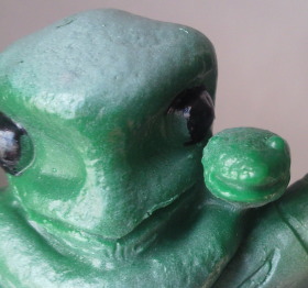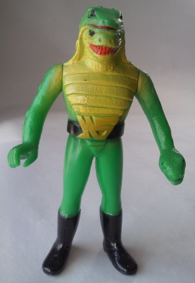 | これは、 無版権の海賊版。 上の正規品とそっくりですが、 よく見ると、 ベルトのバックルや鱗のモールドが粗いです。 サイズもちょっと小さく、全長約11センチ。 |