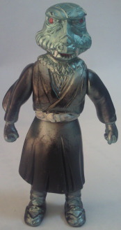 | 海蛇男 ポピー製、全長約11センチ。 『仮面ライダー』第54話に登場した怪人です。 首に巻かれたヘビの 目の中に仕込んだ “プリズム・アイ” で 光の屈折を変化させて幻を現出させ、 世の中を混乱に陥れようとする悪いヤツですが、 人形の方は、 その首に巻かれたヘビの顔が なんとも愛嬌のある笑顔に仕上がっていて、 憎めません。 それに、 本体の顔の方も、 白いからこそ無気味だった実物の眼球を 普通に黒にしちゃってるから、 ケロヨンみたいになってしまいました(笑)。 「バッハハ〜イ!」と聞こえてきそうで、 可愛くてしょうがないです。 |