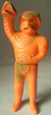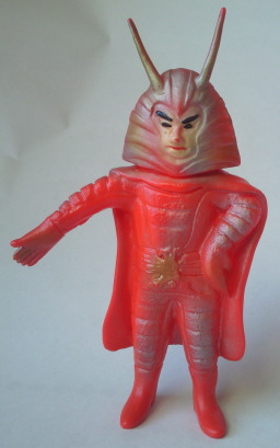 これが、 放映当時に発売されていた、その地獄大使人形。 ポピー製、全長約13センチ。 秘密結社ゲルダム団と併合し、 新たなる新組織・ゲルショッカーを 作ろうと画策するショッカー首領に、 無情にも切り捨てられた身でありながら、 「ショッカー軍団、万歳!」 と叫んで死んでいった哀愁が、 当時のミニソフビのチープさによって、 より切なく感じられます。 直情型の性格を現しているかのような 真っ赤な成形色も、また虚しい。 右腕が、 何か、しなっているようで変な造形ですが、 ムチ状の右腕を持つガラガランダが正体なのですから、 これで正解です(笑)。 |