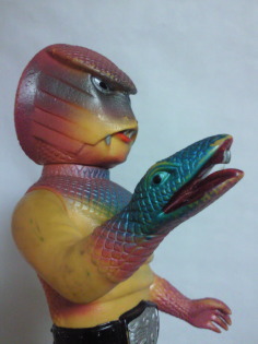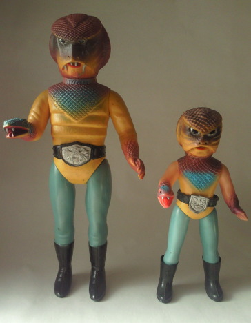 | これは、 『仮面ライダー』の時代劇版と言える『変身忍者 嵐』に登場した、鬼火まむし。 向かって左側の人形が、 バンダイ製、全長約24センチ。 右側が、ポピー製、全長約14センチ。 小田原城から武器・弾薬を奪うのが使命の化身忍者で、 催眠術や分身の術など多彩な忍法を使う、なかなかの強敵だったと記憶しています。 そもそも、 モチーフであるヘビ(マムシ)が発する生理的嫌悪感に加え、 身に纏っている僧衣によって霊力のイメージも備わり、理屈抜きの恐怖を覚える怪人でした。 その悪者然とした容姿の威力は凄く、 人形の方も、 両サイズとも、放映当時発売された昭和ソフビでありながら、 まったく愛嬌がありません(笑)。 |