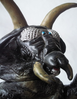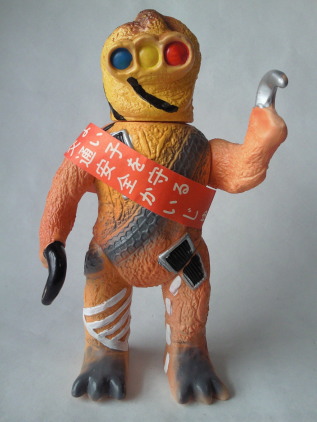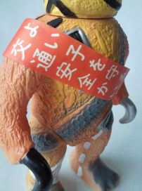 実物のクルマニクラスは こんなたすきはかけていませんが、 たすきに書かれている言葉は、 “よい子を守る交通安全かいじゅう”。 ひき逃げ犯を恨む実物のクルマニクラスの魂を、 交通事故から子供たちを守りたい、 という願いにアレンジしています。 造形のデフォルメを控えた分、 怪獣の存在理由をデフォルメしたわけでもないでしょうが、 やっぱりこの人形には、 作り手の真心を感じます。大好き。 マスダヤさん、ありがとう。 |