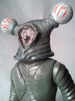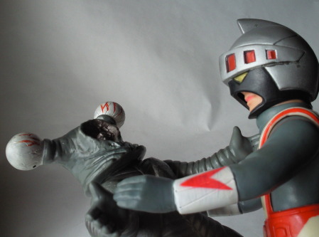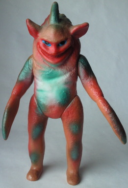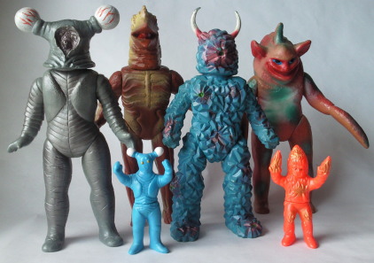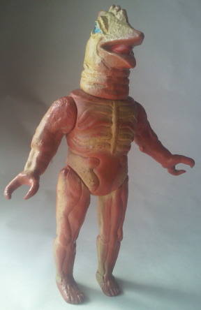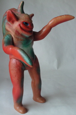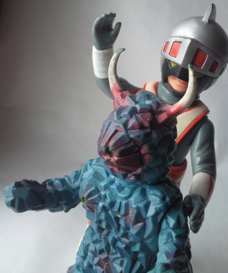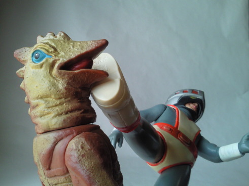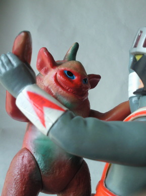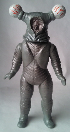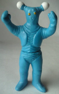 | ややこしい、と言えば、 巨大化後の敵、 つまり巨大な宇宙人は、ミニサイズ人形でしかソフビ化されていません。 等身大の宇宙人の人形より小さい、巨大な宇宙人の人形です(笑)。 |