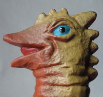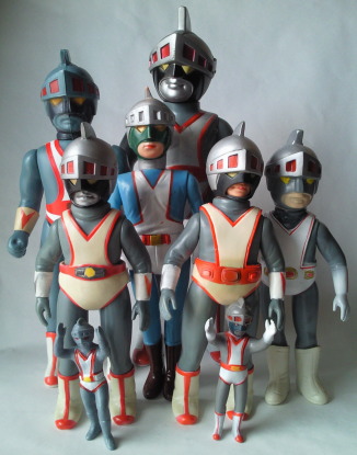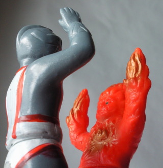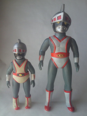 | 向かって左側の人形(全長約11センチ)が、 先述したキルギス星人のミニサイズ人形と一緒に 鉄砲のオモチャとセット売りだったもの。 右側の人形(全長約12センチ)も、 確か、手帳か何かとセット売りされていた記憶がありますが、 ちょっと曖昧。違ってたらゴメンナサイ。 巨大化してからミニサイズ人形で商品化、・・・ややこしいです(笑)。 |