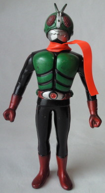 | ディテールにこだわる現在のソフビとは異なり、 なんとも緩い造形ではあるが、 オモチャを手にする子供への優しい眼差しで作られたその外形ゆえ、 人類を護るために命をかけて闘っている仮面ライダーの 愛と哀しみが、 幼い心でも感じ取れるレベルで、人形全体から滲み出ている。 中でも顔は、それが顕著で絶妙だ。 これを “稚拙な造形” としか受け止められない感性は、 “『仮面ライダー』は暴力的” という浅慮に似ている気がする。 |