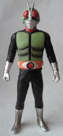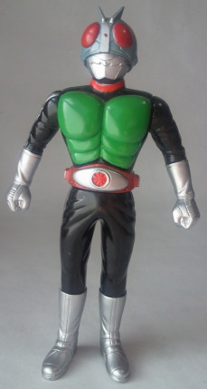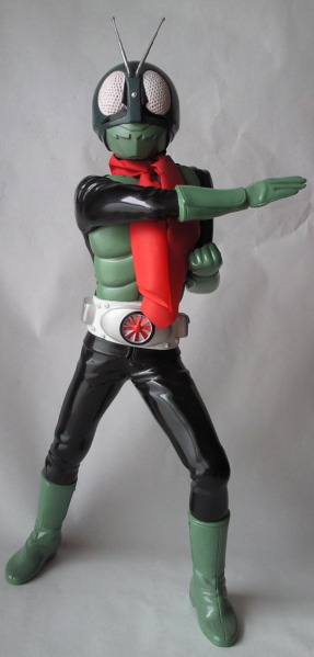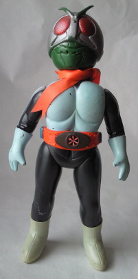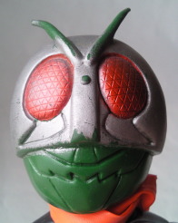 | 先述の放映当時の人形と比べると、 いくらか洗練された仕上がりにはなっているものの、 ソフビブームを巻き起こしたデフォルメ表現が、まだまだ大きく影を落としている。 特に、 複眼の表現やその下の覗き窓のタッチなど、 手づくり感が際立つ顔が、それを色濃く物語る。 愛嬌があるわけでもなく、 かといって 実物のライダーにそっくり、というわけでもなく、 中途半端な見た目である印象は否めないが、 “ソフビ人形という玩具の歴史” という観点で見れば、 デフォルメ志向とリアル志向の狭間に位置する、実に興味深い造形である。 |
