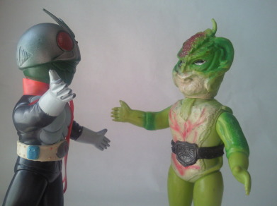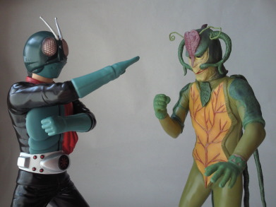 | そして、 平成元年の人形が、こう進化した。 平成16年発売の、 「講談社オフィシャルファイルマガジン仮面ライダー」特製バインダーに、 特典として付属されたソフビ人形だが、 子供が闘わせて遊ぶ人形であるライダーヒーローシリーズが、 京本コレクションと同じコンセプトで商品化されたのである。 こんなソフビが当たり前の時代の子供たちには、 昭和のソフビ・デフォルメ造形の味わいなど、一切理解出来ないだろうなぁ・・・。 |