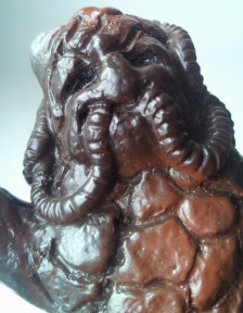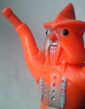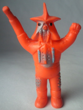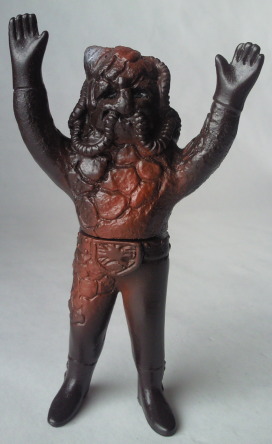 | 子供の頃、 持っていた十数体のミニ怪人を バトルロイヤルみたく闘わせる、という遊びを 僕はよくやっていたのですが、 最終的な勝者は、いつもこの人形にしていました。 こげ茶色のこの成形色に、 “暗色のダンディズム” みたいなものを感じて、 僕の中で、ゴースターを 最強キャラとして設定していたンだと思います。 |