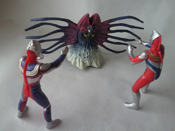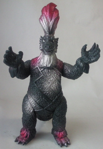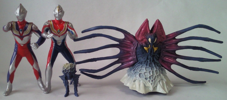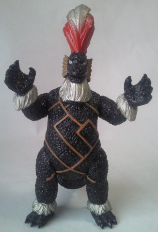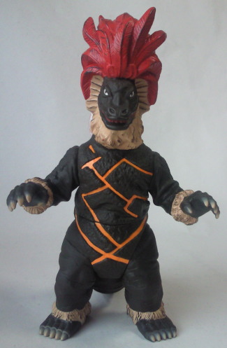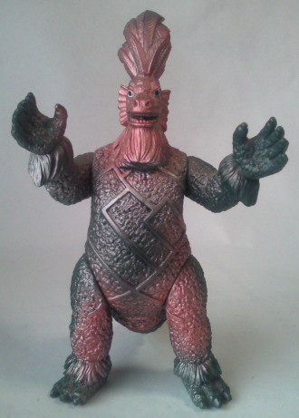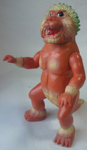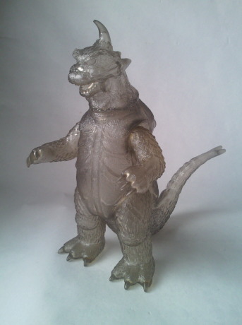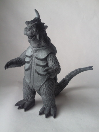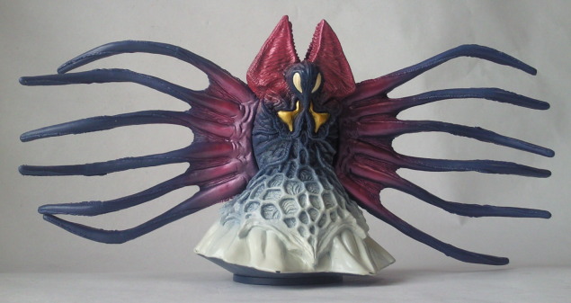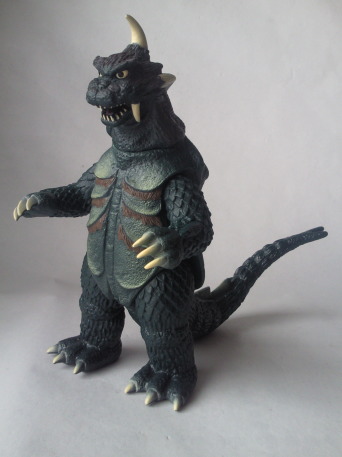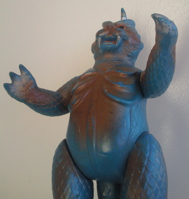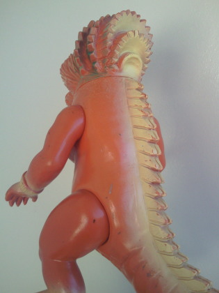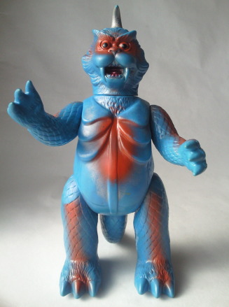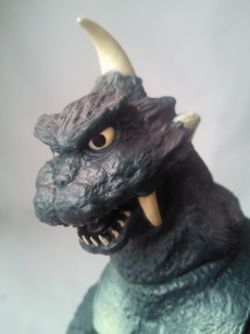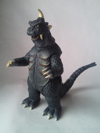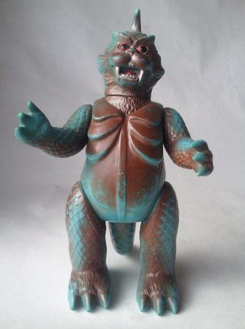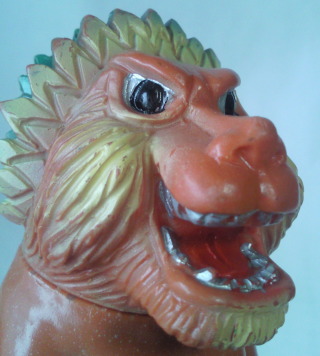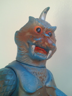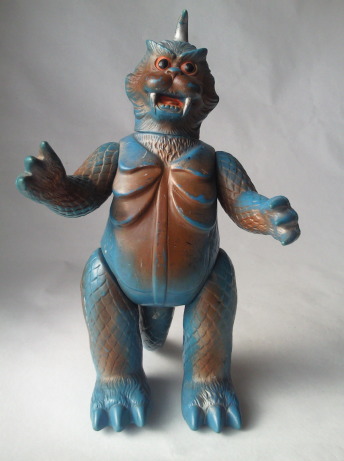 実物の姿に忠実な造形のソフビなのに、 大きさの対比まではリアルな再現が意識しきれていない、という、 そのちょっとだけ残念な感じが、 造形がカッコいいだけに、 余計に気になる、というか、妙に滑稽に映ります。 でも、 きっと、それで良いンだと思います。 オモチャの造形がデフォルメからリアルへと移り変わり、 怪獣映画にCGが使われるような時代になっても、 子供がソフビ人形を手に取り遊ぶ際にはやっぱり想像力が必要、って事ですから。 |