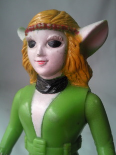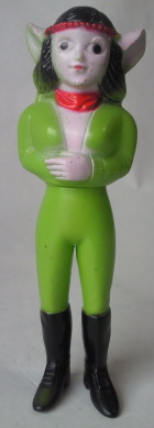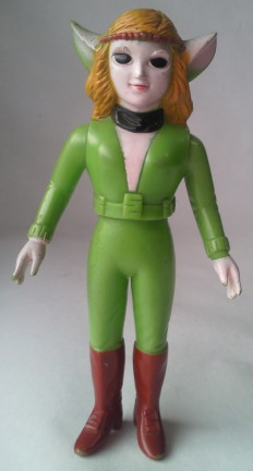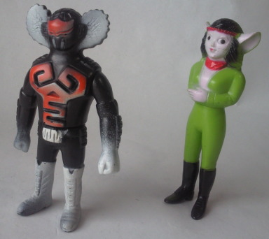 右側の人形が全長約11センチ。 メーカーは、 どちらも、製造元がタカトクで、発売元がブルマァク。 このダルニア、 物腰や何気ない仕種に ちょっぴりエッチな香りが漂う可愛らしさがあり、 それがなんともにチャーミングに感じられ、 放映当時、 小学校の高学年という、 そろそろ異性に興味を持ち始める年頃だった僕の感受性を、妙に刺激してくれました。 それに、 アクマ族とは言え、 卑怯な行為が嫌いだったり、 ザビタン(主人公のヒーロー)に恋心を抱いていたり・・・、と 好感度の高いキャラクターでしたので、 アクマ族を裏切って 途中から人間の味方になる事は最初から予想出来ました。 恋するカレン、ではなく、 恋する “可憐(かれん)”、な女性でしたね(笑)。