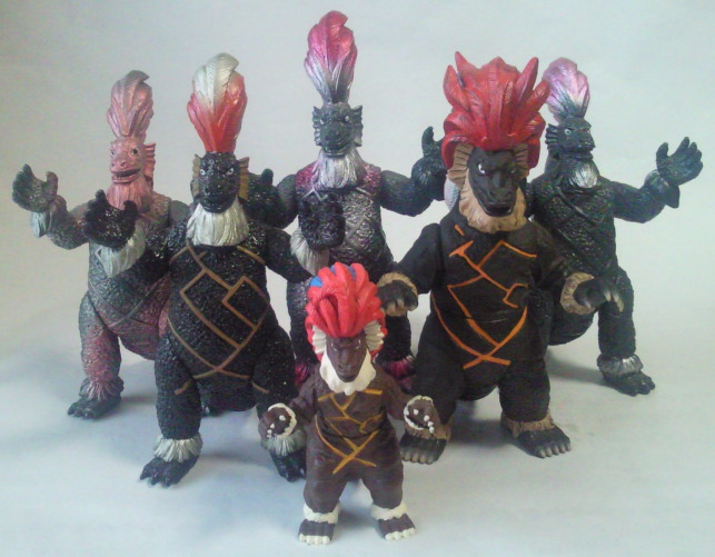 上の4体は、僕が子供の頃のゴメス人形。 幼い子供が見ても泣き出さないように愛嬌を持たせていながらも、 ゴメスという怪獣の怖さや迫力を 決して軽視していないマルサンのデフォルメ造形の絶妙さが、 ただ懐かしいだけでない優良な玩具として、僕を永遠に魅了します。 そして、 下の4体は、現在のゴメス人形。 実物の姿を忠実に再現したこのリアル造形もまた、絶対的なカッコよさで僕を魅了します。 モノクロだった番組の映像に合わせた、 “モノクロ塗装版” なるバージョン(向かって左下)もあって、そのこだわりぶりが面白いです。
