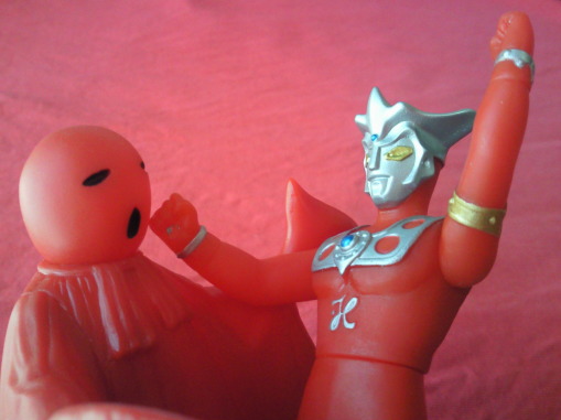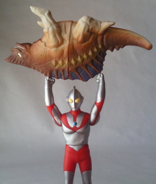 『空で逢えたら』 特撮の神様・円谷英二さんの誕生日は、7月7日。 そう、七夕です。 そして、七夕と言えば、ガヴァドン。 『ウルトラマン』第15話「恐怖の宇宙線」に登場した怪獣です。 お話はこうです。 ムシバ少年が土管に描いた怪獣の絵に、 特殊放射線を含んだ宇宙線が当たって実体化したガヴァドン。 子供の落書きゆえ、その姿はあまりに稚拙。 はんぺんのお化けみたいな、ヘンテコな怪獣でした。 しかも、 ただ寝ているだけ、という拍子抜けにも程がある振る舞い。 そして、 太陽の光が弱まると宇宙線のエネルギーが消耗するのか、 夕方になると姿が消え、元の絵に戻ります。 描いた絵が本物の怪獣になると知ったムシバ少年とその友達らは、 もっと強暴でカッコいい怪獣にしよう、と その夜、元の絵にみんなで手を加えます。 その絵に再び宇宙線が当たって実体化。 今度はたいそう怪獣らしい姿に生まれ変わりましたが、 ムシバ少年たちの願いも虚しく、ガヴァドンはやはり寝ているだけ。 ガッカリです。 ところが、 ただ寝ているだけでも、 イビキがうるさ過ぎて我が国の経済生活をメチャクチャに打ち壊す、 という理由で、 科特隊に攻撃され、延いてはウルトラマンにも痛めつけられることに・・・。 怪獣、ってなんて可哀想な生き物なンでしょう。 「ガヴァドンを殺さないでェ」 というムシバ少年たちの悲痛な声が聞こえたウルトラマンは、 ガヴァドンにトドメを刺す事なく、宇宙のどこかへとその巨体を運び去ります。 そして、 「泣くな、子どもたち。 毎年七月七日の七夕の夜、 きっとガヴァドンに逢えるようにしよう。 この星空の中で・・・」 と約束するのでありました。 今見ると、 見所満載のメチャクチャ面白い回なのですが、 子供の頃は、 なんだかはぐらかされた感が強く、 シーボーズの回と並んで、最もつまらない回でした。 なんたって、 佐々木守・実相寺昭雄コンビの作品ですから(笑)。 描いた怪獣の絵が実体化する、ってところには夢があってワクワクしたのですが、 その後の展開があまりにも・・・。 やっぱ、子供は、 暴れまわる強い怪獣と、それを倒すウルトラマンの勇姿が見たいわけですからね。 けれど、 こういった異端なエピソードが、 『ウルトラマン』の世界を深めて広げたのは、純然たる事実。 この内容にOKを出した当時の円谷プロやTBSが凄いと思います。 しかも、 公園のあらゆるところに怪獣の落書きをし始める子供たちを見て、 科特隊のムラマツキャップの心が真っ暗になる、っていうシニカルなラストも効いています。 佐々木さんや実相寺さんをはじめ、 番組を制作していたスタッフの方々の、その豊かな才能と鋭いセンスに脱帽です。 ちなみに、 七夕(7月7日)が円谷英二さんの誕生日、と先ほど述べましたが、 戸籍上の誕生日は7月10日だそうで、 僕の誕生日と同じなンです。 なんだか運命を感じます(感じたモン勝ち(笑))。 ちなみにちなみに、 元AKB48の前田敦子さんも、僕と同じ7月10日が誕生日。 運命は感じないけど(・・・いや、感じたモン勝ちなのだから、感じておこう(笑))、 なんか嬉しいです。 ・・・って、 おもいっきり話が脱線しました。スミマセン。 閑話休題、ガヴァドンのソフビです。 まずは、 バンダイ製 食玩(商品名:ウルトラマンソフビ道)の2体。