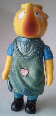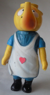 『がんばれ!!ロボコン』に登場する、 焼いも屋の見習いロボットです。 ロボットなのに、 屋台を引いて焼きいもを売るし、臭いオナラもします。 ロボットといってもロボコンの仲間ですから、 人間以上に人間らしい、というのが特徴ですからね。 向かって左側の人形は、 名古屋の骨董市で買った中古品ですが、 右側の人形は、 20年くらい前、 なんと、 川越のオモチャ屋さんの倉庫から、 袋入り新品の状態で発掘したものです。 会計の際、 「名古屋から来ました」 って言ったら、 店主のおじさんが、 「えっ? そりゃまぁ、ご苦労さんな事で・・・」 と、驚かれ、 甘くて美味しい蒸かし芋をごちそうしてくれました。 お店の近くにある御自宅から、 奥さんと思われるおばさんが たまたまおじさんのおやつ用に持ってきたものだったのですが、 湯気がたっている鍋ごとそのまま僕に差し出す、という おじさんの飾り気の無さが印象的だったので、よく憶えています。 その時は、 川越とサツマイモの関係など全く知らなかったのですが、 焼きいも屋のロボット・ロボプー人形を サツマイモの聖地・川越のオモチャ屋で見つけて 店主にをイモをふるまわれた、 なんて、 ずいぶん出来すぎた話だったンだなぁ・・・、と 今しみじみ感じています。 余談ですが、 田宮二郎さん主演のテレビドラマ『高原へいらっしゃい』の中で、 ホテルの従業員役だった由美かおるさんが、 宿泊客の子供が持っていたオモチャで一緒に遊んであげるシーンがあり、 ロボプーのミニ人形が使われていたのを憶えています。 その子供に 「これロボプー。オナラするンだよ」 と教えられて、 「まぁ」 と優しく微笑む由美かおるさんが、 子供心にとても素敵なお姉さんに思えたものです。 それがずっと頭にあったので、 以前、 『がんばれ!!ロボコン』を知らない僕の彼女に、 コレクションケースからこのロボプー人形を取り出し、 その『高原へいらっしゃい』の子供を真似て、 「これロボプー。オナラするンだよ」 教えてあげた事があるのですが、 「ふ〜ん」 と言われたので、 「違うっ! “ふ〜ん” じゃなくて、“まぁ” だ!」 と、 女性の正しく美しい所作を指導してあげました(笑)。 |