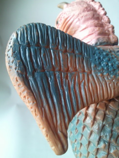 これらは、 昭和の終わりから平成の始めに発売されていた、 バンダイ製 ウルトラ怪獣シリーズ(ウルトラ怪獣コレクション)。 左の人形(初版)のみ、全長約17センチで、 下の3体は全長約16センチ。 |