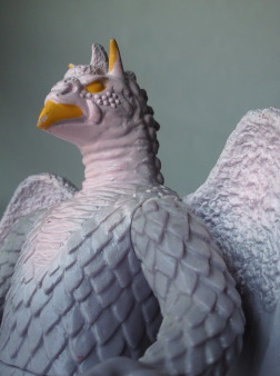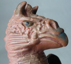 | リアル志向のシャープな造形である事と 目の玉を描かずに顔の表情を表現している事から、 何やら血の通わぬ印象で、 実物のヒドラよりも モデルとなった石像の冷たさをイメージしてしまいます。 むしろ、 先に紹介したブルマァクやポピーの人形の方が、 怪獣に宿った人間の霊魂が感じられて、 実物のヒドラをイメージしやすい気がしますね。 |