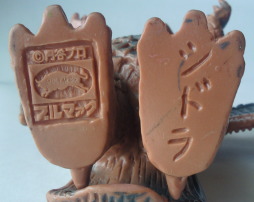 原型師が江戸ッ子だったのか、 足の裏に “ヒドラ” ではなく “シドラ” と 彫られているのは、 ソフビコレクターの間では有名な話です。 これもまた、アンティークソフビの味わいの妙(笑)。 |