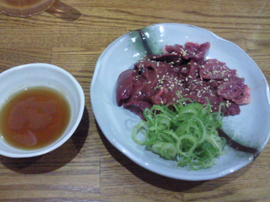 | 僕が必ず最初に注文するのがコレ、肝刺し。 絶品です。 「そのまま出してるだけで、ボクは別に何もしてないから・・・」 と大将は謙遜しますが、 こんなに美味しい肝刺しは、なかなか無いと思います。 もう、ビール飲んでコレ食べたら帰ってもいいくらい(マジ)。 |