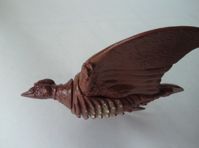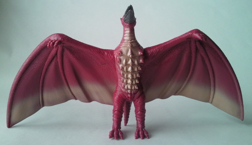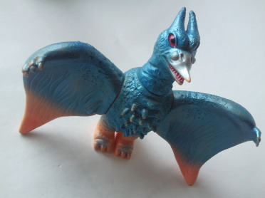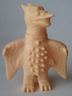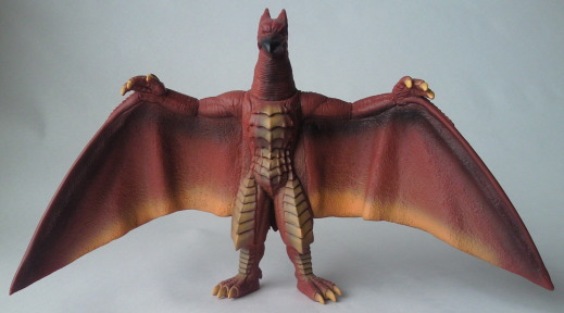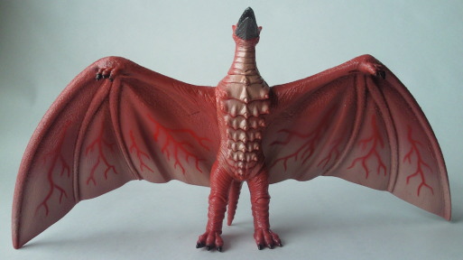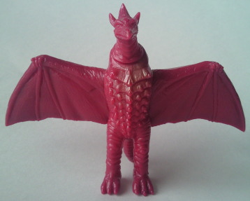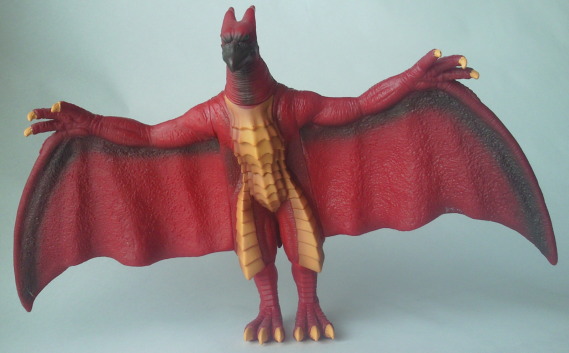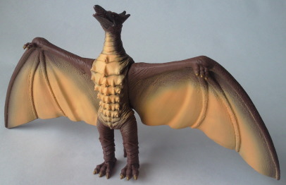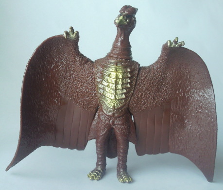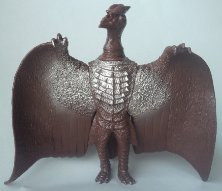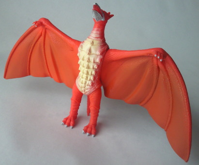 | これは、 ミニソフビのセット(商品名:ゴジラ怪獣快進撃)の中の1体で、 飛行時の姿が再現されています。 カッコいいです。 バンダイ製で、全長約10センチの横幅約11センチ。 |