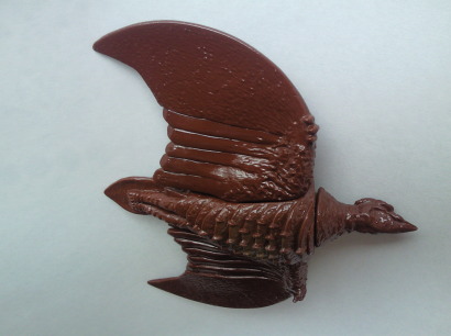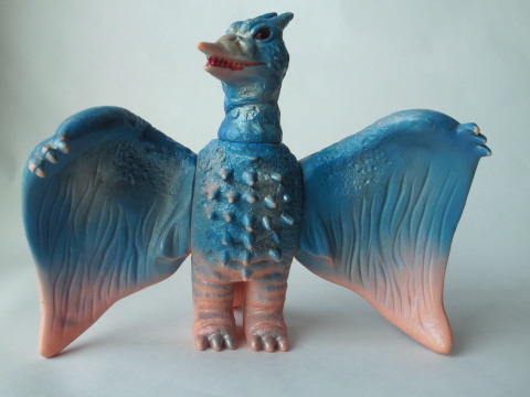 | 大きな翼、 好戦的な性格が感じられる顔の表情、 飛行しているようにも 仁王立ちして相手を威嚇しているようにも見える、その佇まい・・・、 それらは、 ラドンという怪獣の迫力を、力強く、かつ正確に伝えていてます。 それも、時代柄、 子供のオモチャとして愛嬌のあるデフォルメを施しながら、のそれですので、 原型師の技量の高さやセンスの良さが覗い知れようというもの。 素晴らしいです。 青以外にも、 たとえば緑とか黄色とか紫とか、 どんな素っ頓狂な色に塗り替えられても揺らがない、“凄味” があります。 軸がブレないその感覚は、 安定した人気でゴシラ映画のレギュラーの座に居座った、 ラドンの存在感そのもの。 |