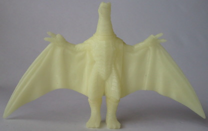 | こちらは食玩。 バンダイ製 ミニバトルG(全長約10センチ、横幅約14センチ)。 蓄光タイプの人形は、HMV限定販売のもの。 赤かったり光ったり・・・、 やっぱりファイヤーラドンみたい(笑)。 |