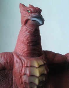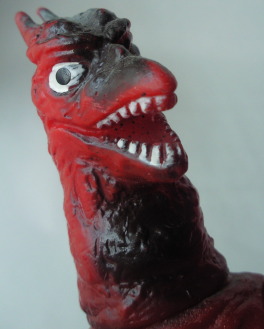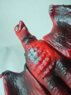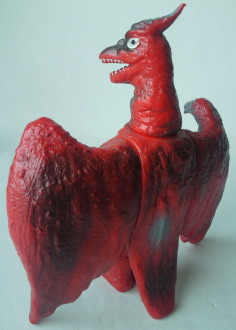 これは、 昭和50年代の商品です。 成形色に赤が用いられているのは、 『空の大怪獣ラドン』のラストで、阿蘇山の噴火に呑まれて焼死する際のイメージでしょうか・・・。 そのせいか、 顔の表情が “断末魔の叫び” をあげているようにも見え、 哀愁というか痛苦というか、 なんとも切ない雰囲気があり、 堂々と立っているブルマァクのラドン人形とは、同じポーズでも、また違った味わいがあります。 |
