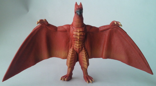 | バンダイ製 ムービーモンスターシリーズ(全長約15センチ、横幅約26センチ)。 『ゴジラ vs メカゴジラ』に登場したラドン(ファイヤーラドンになるラドン)とは、 形状も異なるまったくの別怪獣なのですが、 このソフビは、 ファイヤーラドンを彷彿とさせる彩色になっていて、まぎらわしいです(笑)。 赤が強くて、明る過ぎますね、全体的に。 |