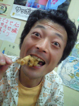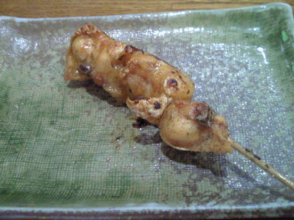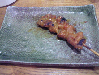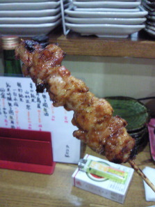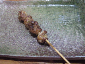 | スーさんのお気に入りは、ハツモト。 ハツ(心臓)と肝の 繋ぎ目にあたる部分ですね。 程よい歯応えが、クセになります。 ってか、スーさん、焼鳥通だなぁ・・・。 |