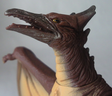 | バンダイ製 ムービーモンスターシリーズ・劇場限定版(全長約15センチ、横幅約26センチ)。 そのまぎらわしさを帳消しにして余りある、暗いトーンの彩色。 ファイヤーラドンと見紛う事はありませんが、これでは暗過ぎ(笑)。 劇中の、夜のニューヨークを襲撃したシーンでも、こんなに暗い色には見えなかったような・・・。 |