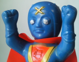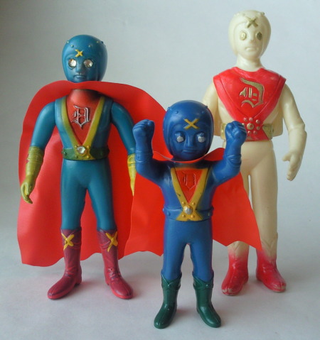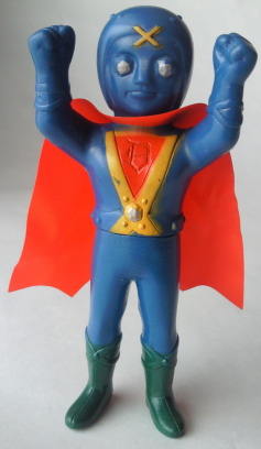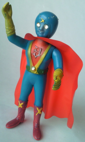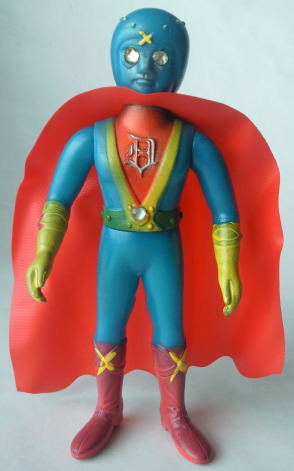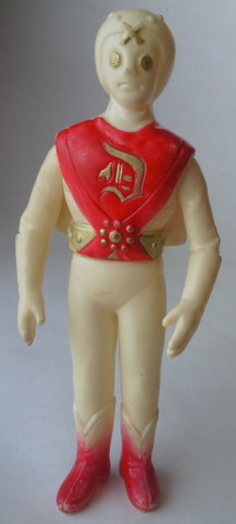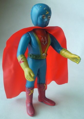 これは、 海賊版の人形で、全長約15センチ。 なぜか、 全身が白。 光沢のある青い姿の実物とは、あまりにもかけ離れたイメージです。 原作者が川内康範先生だから、 月光仮面やレインボーマンと同じような 白いコスチュームのヒーローだろうと勝手に思い込んで、 実物のダイヤモンド・アイの姿をチェックする事なく、安易に製造したのでしょうか? ノーテンキな人形です。 贋物でお金儲けしたいなら、 なんで、 ちゃんと番組を見て、 少しでも正規品に近い造形・彩色の人形にしないのでしょう? ・・・あ、もしかして、 “騙して売りたいわけじゃない” という、 贋物を作る者には贋物を作る者としての、 “ポリシー” というか “良心” というか、そんなものが当時はあったのでしょうか?(笑) |
