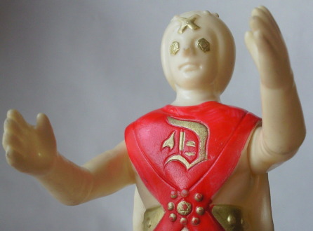 | ポピー製、全長約13センチ。 目とベルトのバックルは、 本体とは別パーツで、ダイヤガラスが接着してあります。 でも、今の僕には、 ガラスではなく、 本物のダイヤモンド・・・いや、それ以上に輝いて見えます。 紹介すべきソフビが見当たらず(思いつかず)呆然としかけていたところを、 「私がいるじゃないか」 とでも言わんばかりに僕の目に飛び込んできた、神々しい “光” だからです。 |