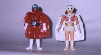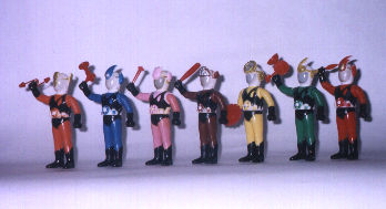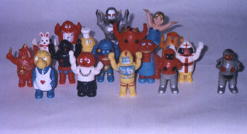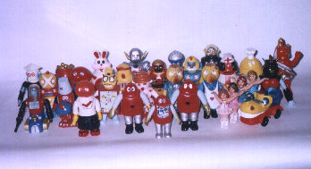 こちらはミニサイズより更に小さい人形。 なぜかロビンちゃんがみんなより大きい(笑)が、 両手をあげてワーッとみんなで走ってきそうで 実に微笑ましい。 番組の前期に登場した16体のセット売り。 けれど、ロボワルに このような赤とグレーのバージョン違いが存在する為、 1セット買っただけでは揃わない。ウララ〜。 |