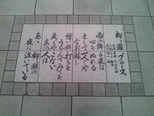 子供の頃に意味も解らず歌っていた、と言えば、 僕は、 橋幸夫さんの『霧氷』や美川憲一さんの『柳ヶ瀬ブルース』を 3〜4歳の頃によく歌っていたそうです。 自分でも なんとなく記憶にあるのですが、 生前、両親から、 「始めから終いまで間違えず、上手に歌っとった」 と聞かされていました。 テレビから流れていたヒット曲をなんとなく覚えたンでしょうけど、 我ながら、渋いセンスの子供です(笑)。 そして、 『柳ヶ瀬ブルース』と言えば、 今回の骨董市の会場・金神社のすぐ隣、 歩いて5分もかからないところが、その柳ヶ瀬なのです。 中部地方有数の歓楽街ですが、 なんといっても『柳ヶ瀬ブルース』で全国的知名度を得たわけで、 商店街には、道のど真ン中に、 『柳ヶ瀬ブルース』の歌碑が埋め込まれています。 |