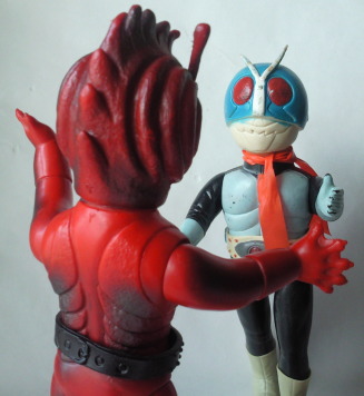 そもそも、 ヤモゲラスという怪人自体、 不気味ではありましたが決して “強敵” ではありませんでしたし、 ショッカー怪人最後の見せ場でもある死に様も、 ライダーキックで倒されるのではなく 白川博士が放ったデンジャーライトを浴びて消滅、 という地味なものでしたので、 この人形の 顔がカッコ悪い事によるちょっと残念な感じは、 そんな、 ヤモゲラスという怪人の身性や劇中から受ける印象を絶妙に表象していたわけで、 誠にもって愛すべき造形である、と言えます。 前回紹介した、 さそり男人形や蝙蝠男人形の、 実物の怪人の怖さ・無気味さを緩和した裁量もそうですが、 “似せる事だけを是としていない” 昭和ソフビのデフォルメ造形は、 オモチャとは何か? オモチャは誰のものか? オモチャは何のためにあるのか? を改めて認識させてくれます。 |
