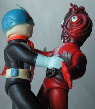| 僕は子供の頃この人形を持っていましたが、 我が家に遊びに来た従弟に、 「顔が似とらんで、なんかカッコ悪い」 と言われた事を憶えています。 僕としては、 欲しくて買ってもらった人形ですし、 その従弟ほど否定的な印象は抱いていませんでしたが、 そう言われてみるとそうだなぁ、 って確かに思いました。 |