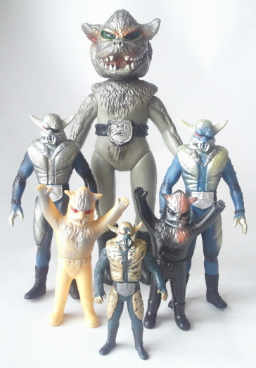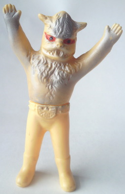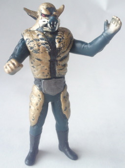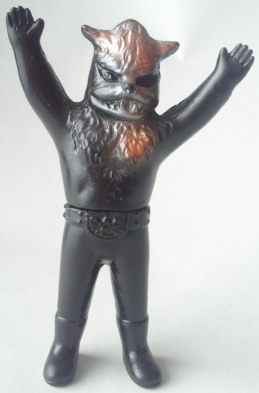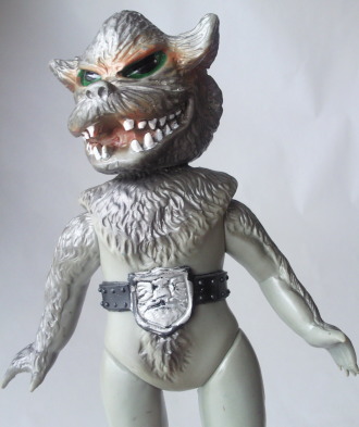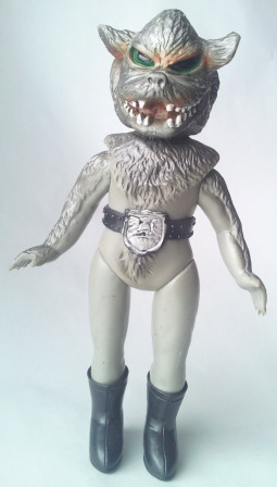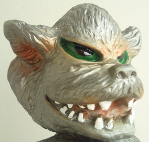 放映当時に発売されていたこの人形は、 時代柄、当然デフォルメ造形であり、 彩色も、 このようにグレーで、金色でも紺色でもありません。 ゆえに、 これを手にした子供自身の空想力で、 ゾル大佐の正体の狼男にも実験用狼男にも、 どちらにも見立てて遊ぶ事が出来るわけでして、 オモチャがオモチャらしく 子供の夢を育んでいた時代の産物、と言えるのであります。 とはいえ、 リアル造形支持派からは鼻で笑われ否定される事も、理解出来ます。 この、 幼児向け絵本(例えば『赤ずきんちゃん』とか『三匹の子豚』とか)に 出てきそうな擬人化された狼のような顔は、 デフォルメ・アレンジと言うより、完全なる差し替えであり、 ショッカー怪人・狼男とは 全くの別人になってしまっていますからね。 |