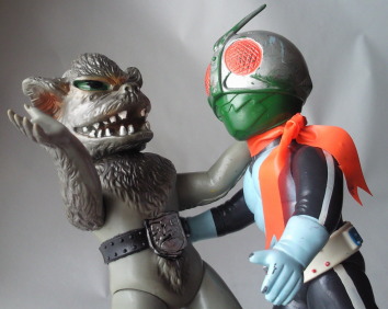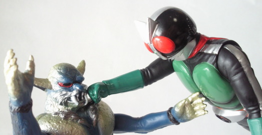 | 前々回のさそり男人形と蝙蝠男人形、前回のヤモゲラス人形、と 最近ずっと述べている、 “幼い子供が泣き出さないように配慮された、当時のオモチャならではの造形” ではあるのですが、 ちょっと、度が過ぎてるな、 って思います。 ここまで実物の怖さを消してしまうと、興醒めしてしまう感すらあります。 ライダー人形と闘わせても、 実物と違いすぎて、 テレビで観たバトルシーンがなかなか熱く甦ってきませんし・・・。 |