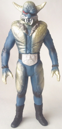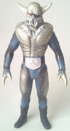 | というわけで、狼男。 バンダイ製 スタンダードサイズ。全長約26センチ。 『仮面ライダー』第39話に登場したショッカー怪人。 ショッカー日本支部の初代大幹部であるゾル大佐の、醜いその正体でもあります。 ゾル大佐の正体は怪人だった・・・、 あれは子供心に衝撃的でしたねぇ、なんとも。 シビレました。 しかも、 世界的に有名な古典的モンスターである “狼男” なのですから、特別感は満点。 大幹部の正体としては、これ以上ない怪人でした。 ただ、劇中、 ゾル大佐の正体とは別に、“実験用狼男” なる、別の狼男も登場します。 両者は、 胸や太腿など、部分的に形状が若干異なるのと、 彩色が、ゾル大佐の正体の狼男が金色であるのに対し、実験用狼男の方は紺色、 という、一目見て判る差があります。 |