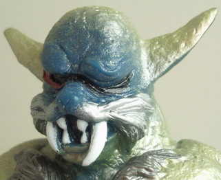 | この、“突然、緑” という ぶっ飛んだセンスのおかげで、 愛嬌を持たせすぎた顔の造形がキュッと引き締まった感があります。 こんな目をした怪人に、 温かい血など絶対に流れていませんから(笑)。 殺戮を楽しむゾル大佐の残忍性にも繋がっている気がして、 僕は好きですね、この白目・・・いや、緑目。 ショッカー怪人の人形なら、やっぱ、少しは無気味でないとね。 |