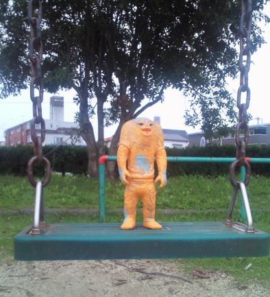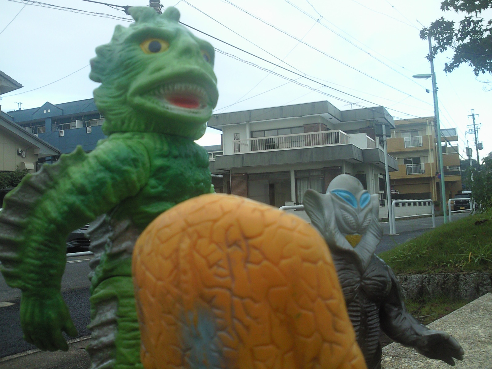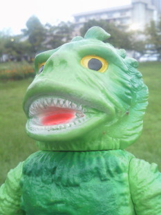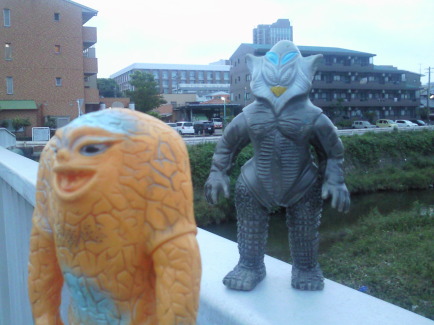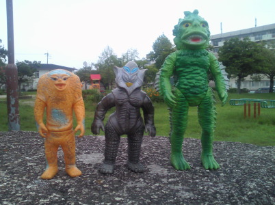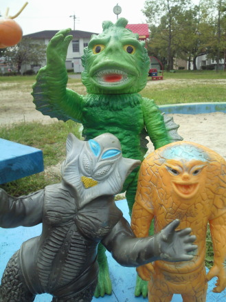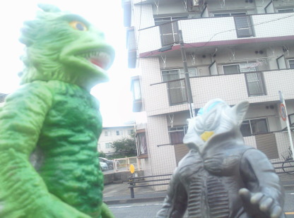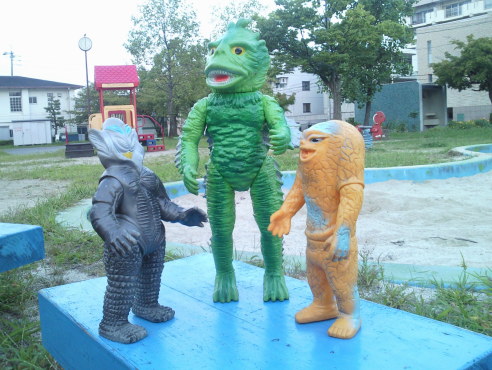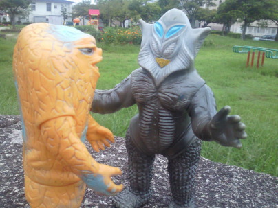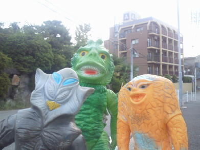 | メ「『ウルトラ怪獣散歩』、おもしろいですねぇ」 ラ「あれをソフビでやろう、と?」 ジ「それで今日は僕ら3体が、 御主人様のコレクションケースを飛び出して、 こうしてお天道様の下にいるわけなンですね」 メ「たまにはイイでしょ?こういうのも」 ラ「イイけど・・・」 メ「ん?どうかしました?ラゴンさん」 ラ「いや、俺だけ、サイズが違うンで、見た目が変じゃないかな?って・・・」 |