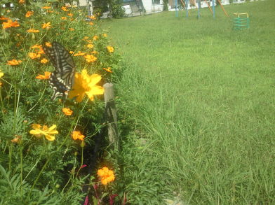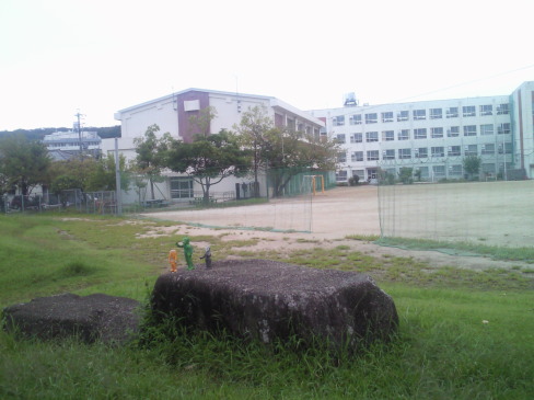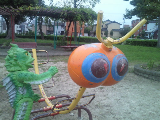 | メ「え? あ、いやいや、何も。 ・・・そうだ! まず、この公園の説明をしましょうね。 え~っと、ここはですねぇ、 このエッセイの連載でお世話になってるゲイトウエイさんの、 店舗の裏にある小学校に隣接してる公園なンです。 なんと、 運動場から敷地が繋がってるンですよ。 広いですし、 ブランコや滑り台のほか、怪獣みたいな遊具もあって、 気持ちよく遊べる場所です」 |