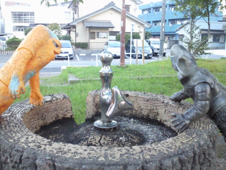 | メ「さて、公園に戻ってまいりました。 ラゴンさんにジャミラさん、 初めてのソフビ怪獣散歩、いかがでしたか?」 ラ「いやぁ、楽しかった」 ジ「また、やりたいですね」 メ「そうですね。もっといろんな所に行きたいですね」 |