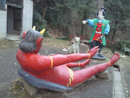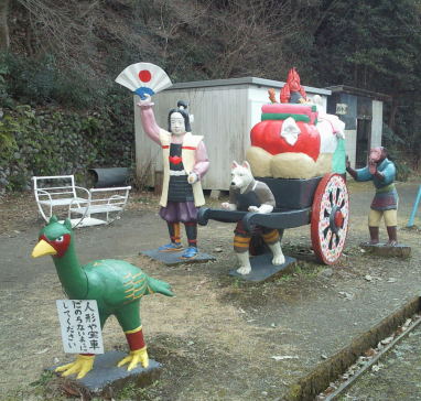 桃太郎や鬼たちのコンクリート像が境内に点々と建っていて、