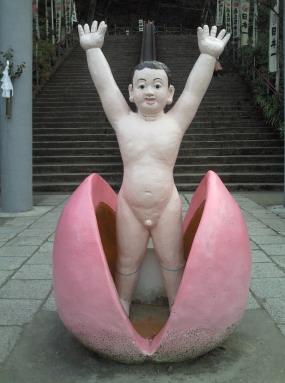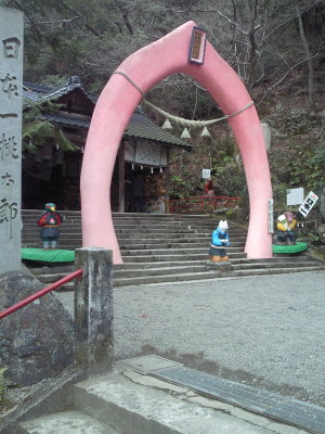 | コンクリート像たちと共に、 この神社の象徴である、桃を象った鳥居。 この鳥居をくぐれば、 悪は去る(サル)、病は居ぬ(イヌ)、災は来じ(キジ)、 というわけです。 ・・・ってか、 鳥居、って、 “鳥居の形” してなくても別にいいンだ(笑)。 |