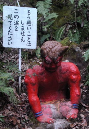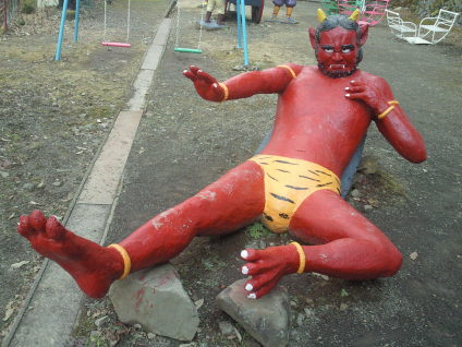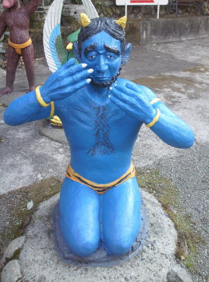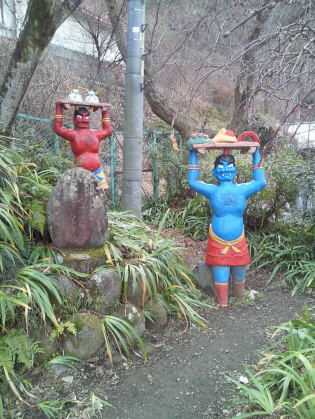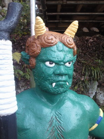 そういえば、 神社の入り口付近に建ってるこの鬼、 45年前に僕が来た時は、全身が青い色をしていました。 すべての像が 劣化防止のため塗り替えられているようですが、 青鬼から赤鬼に塗り替える、 というのは、 いただけませんなぁ・・・。 それぞれ性格も異なる、別個のキャラクターですから。 だって、 『アクマイザー3』で言ったら、 アオニーダがアカニーダになっちゃう、って事だよ。 ダメでしょ、そりゃあ(笑)。 |