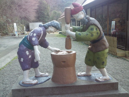 | お爺さんとお婆さんもいます。 山へ柴刈りに行ったり、川へ洗濯に行ったり、 二人で仲良く楽しそうに “きびだんご” を作ったり・・・。 |