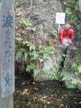 | 桃太郎にやっつけられて、 今までの悪行を反省し、泣いて謝っている鬼たち。 実際に涙を流す赤鬼の方は、 湧き水が目を通って流れ出るしくみのようです。 凝ってるなぁ・・・(笑)。 |