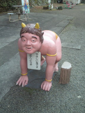 高木ブーさんではありません(笑)。 「背中へどうぞ」 と、やさしい鬼です。 僕も、 45年前に このとおり乗らせてもらいました。 けど、 今回は乗りませんでした。 だって、 もう、大人になっちゃって、重いですから、僕。 やさしさには、やさしさで返します(笑)。 |