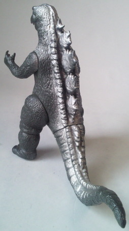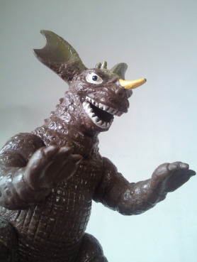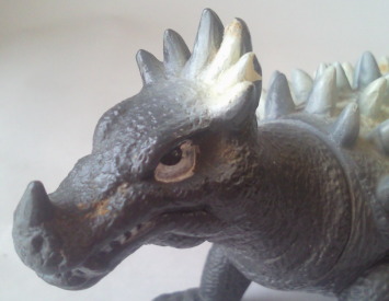 | 敵をにらみつけているような目、そして、躍動感のある尻尾・・・、 いつでも暴れてやるぜ、って感じの、 いなせな怪獣人形です。 |